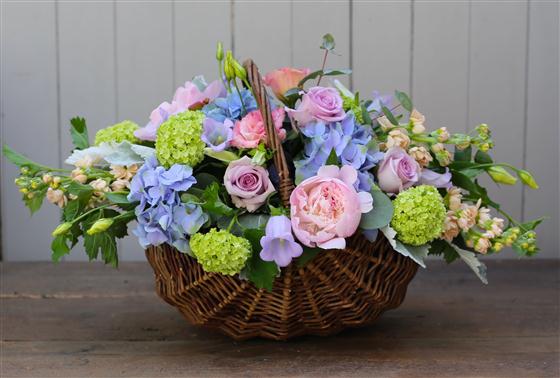 A combination of Blues, Soft Pinks and Mauves with seasonal foliage in one of our vintage basket ,flowers selected by our florist best summer blooms available today. wicker basket may not be as seen in picture .