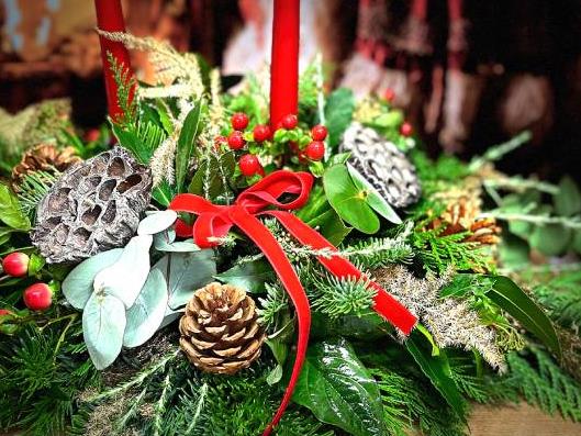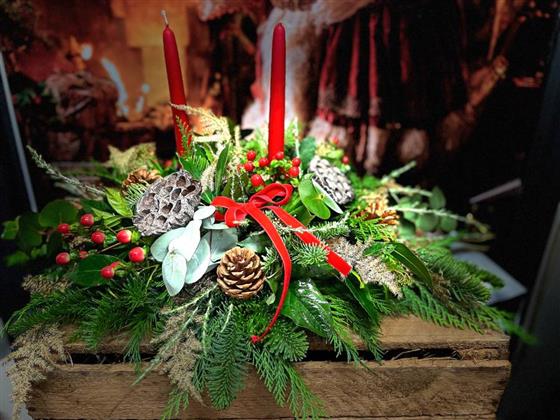 Christmas double candle arrangement with scented Christmas greens, pine, holly, eucalypts, cones, berries, cinnamon sticks and velvet bows ideal for long table setting.