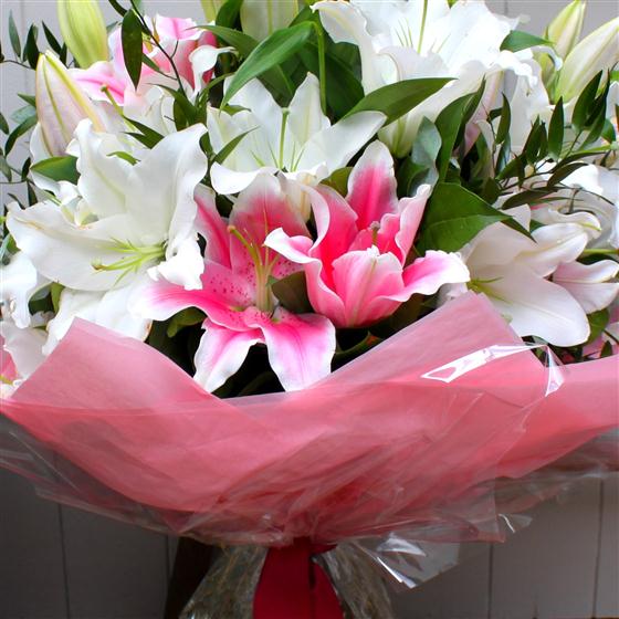 A hand tied bouquet of the finest oriental lilies. Beautifully arranged with seasonal foliage this heavily scented long lasting bouquet is sure to please. Please note that lilies are sent out in bud to guarantee a long vase life.