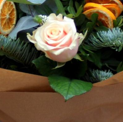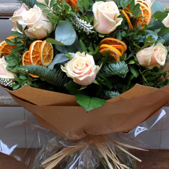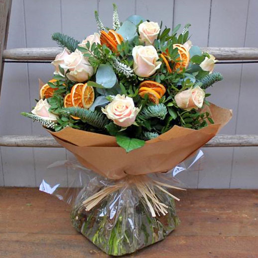 Palest cream roses, white veronica, eucalyptus and dried orange slices are the ingredients of this unusual beautifully scented hand tied bouquet.
