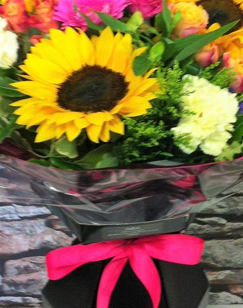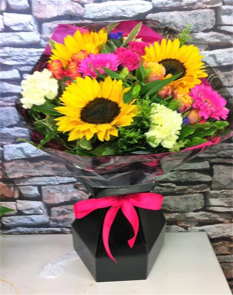 Beautiful bright and cheerful selection of sunny sunflowers gerberas spray roses solidago and seasonal foliage presented in our luxury floral box vase.