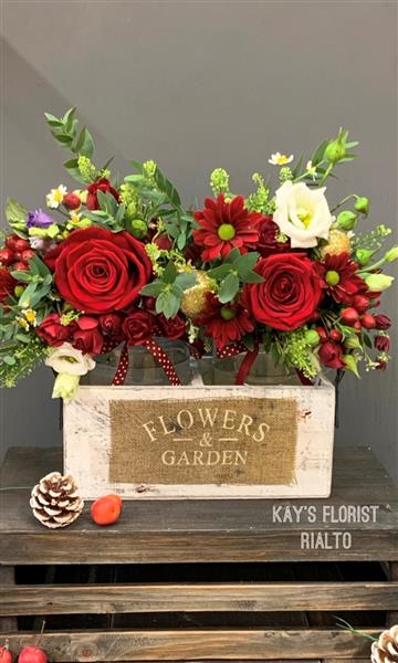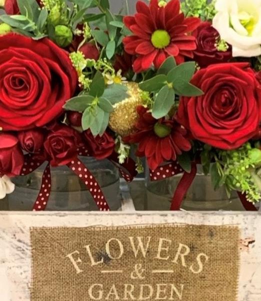 2 jars of Christmas joy including scented pines ,greens and berries with fabulous roses and seasonal blooms